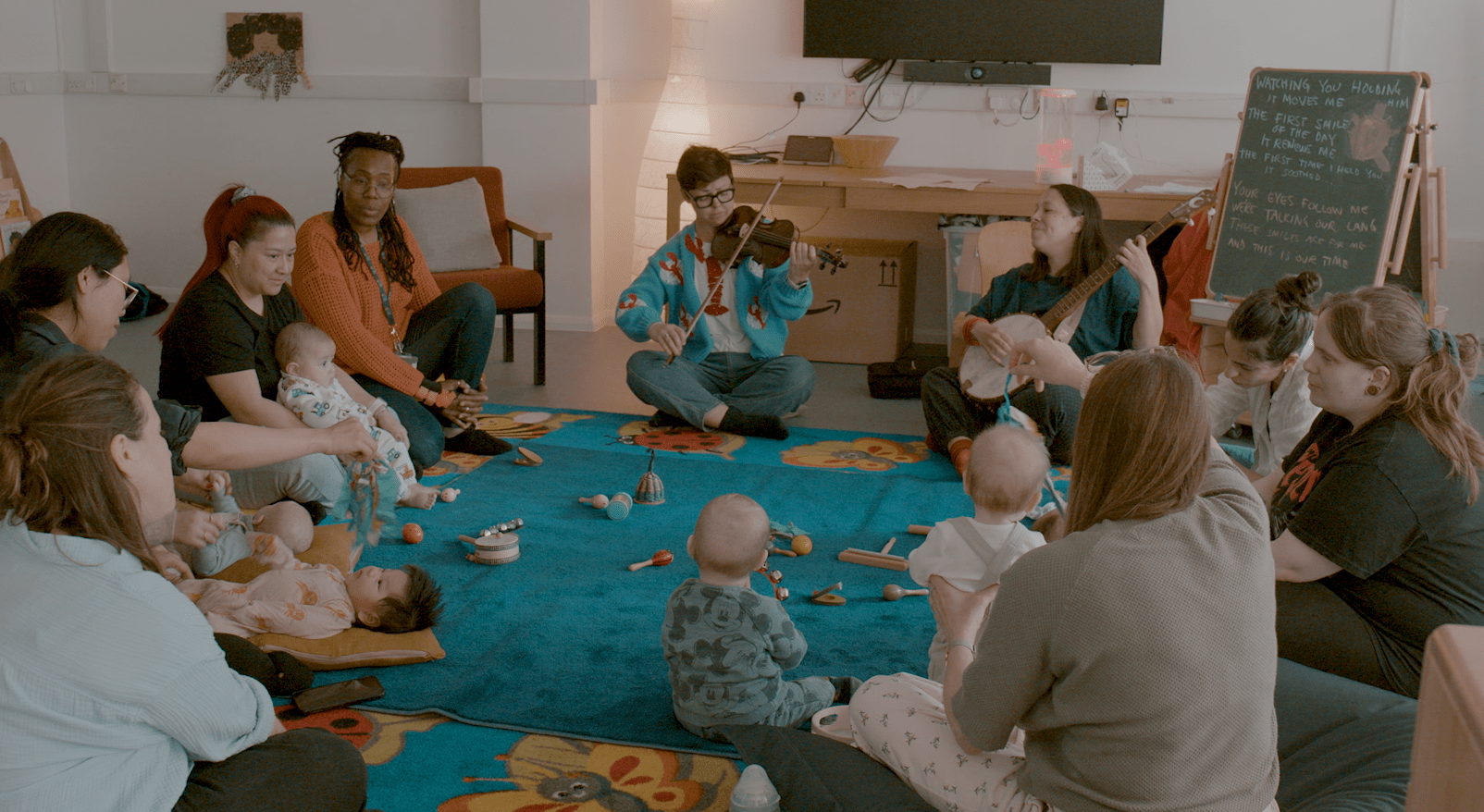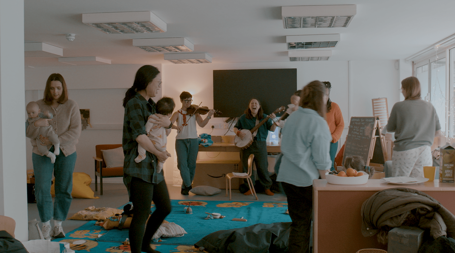The focus is on connection – between parents and babies, and between parents in the room. Sessions are led with an approach that emphasizes openness, togetherness and creativity, allowing parents to share experiences and express themselves through singing (with an international repertoire) and movement. A collective song-writing process supports participants to give voice to lived experience and self-expression.